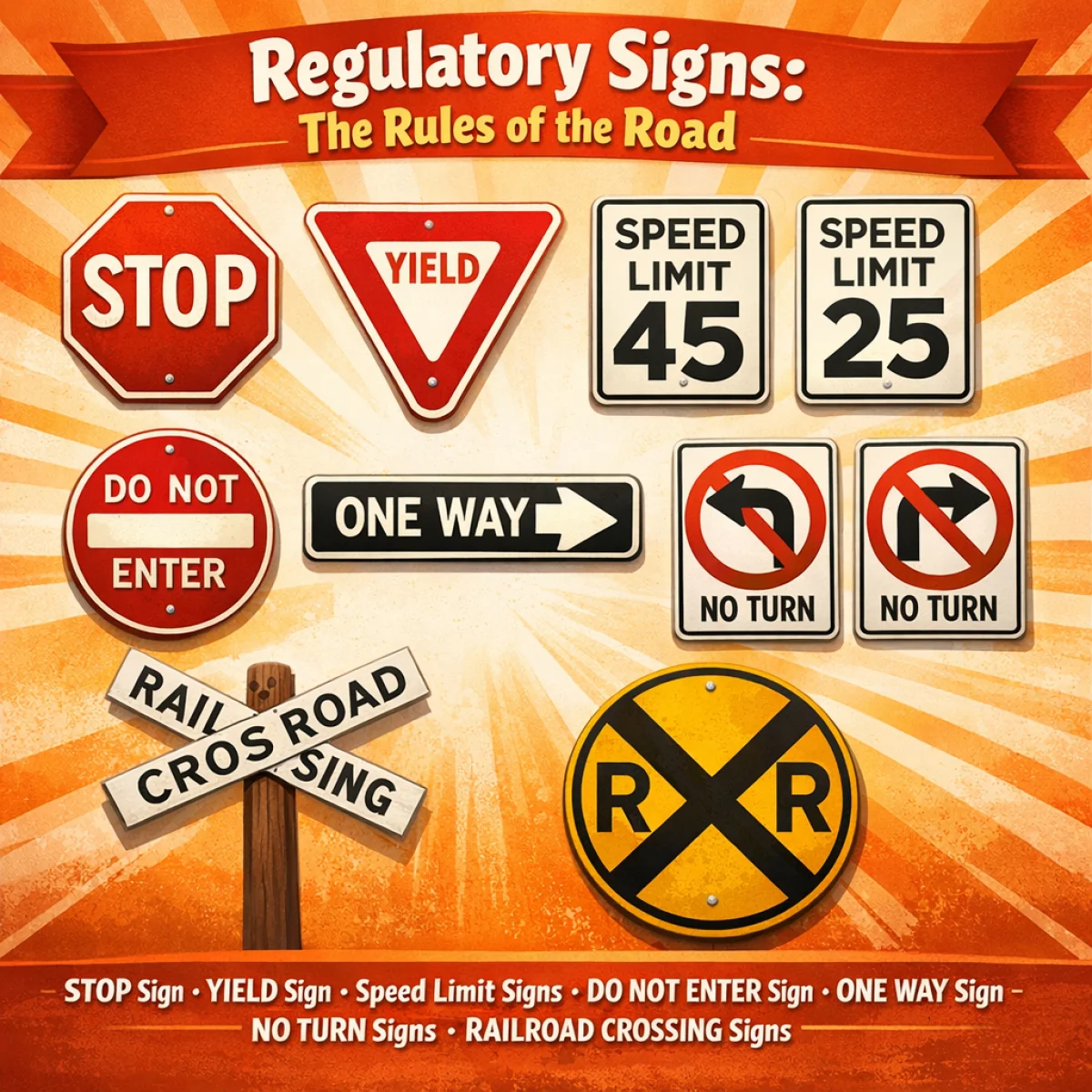 Regulatory signs tell you what you must or must not do. These signs have legal force, meaning violating them can result in tickets or penalties.